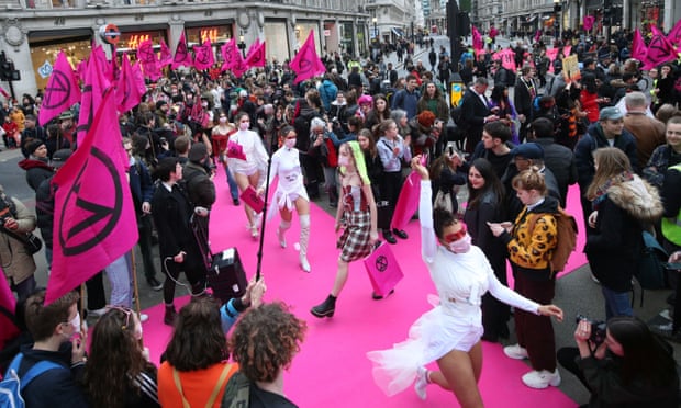 Extinction Rebellion stage a mock fashion show in London’s Oxford Circus to protest against the industry’s wastefulness and carbon footprint. Photograph: Yui Mok/PA